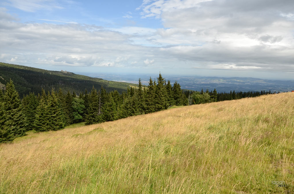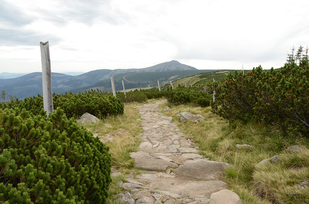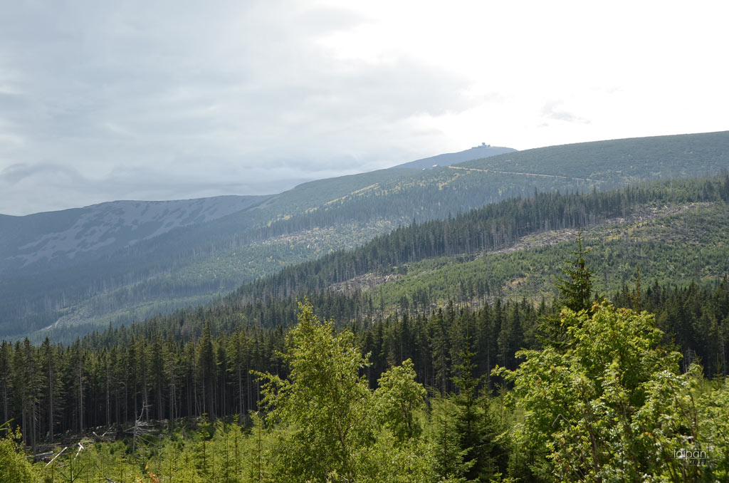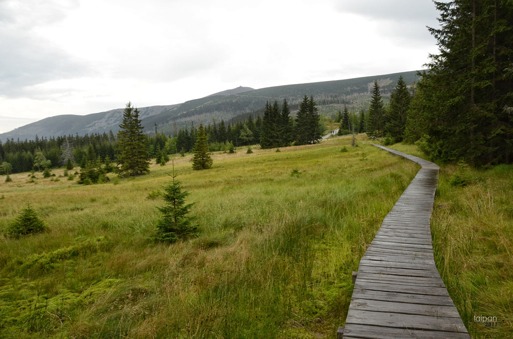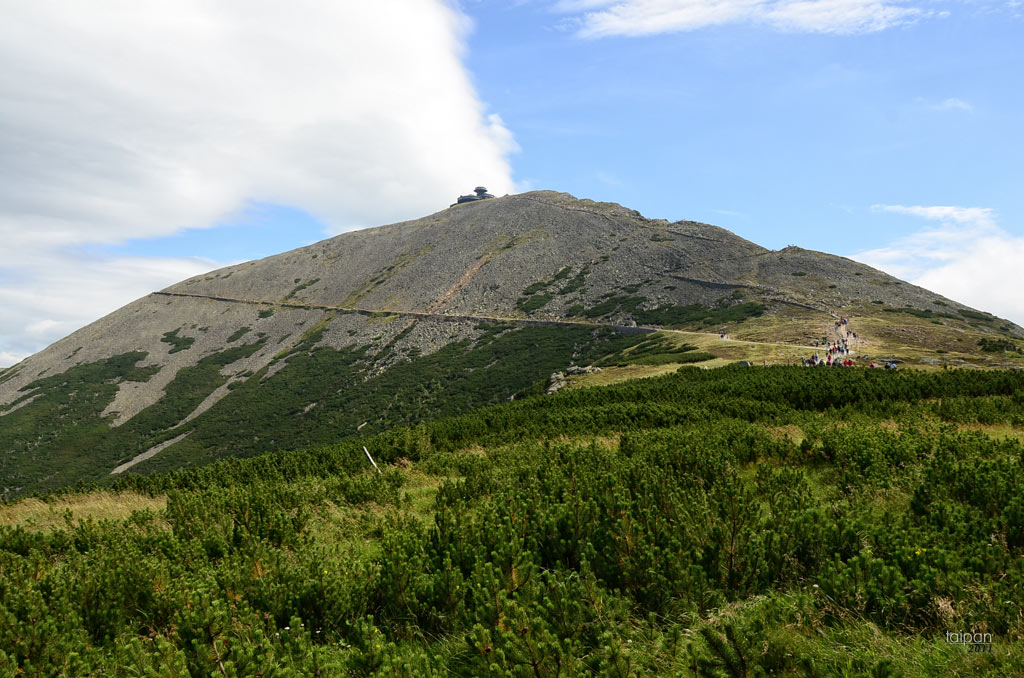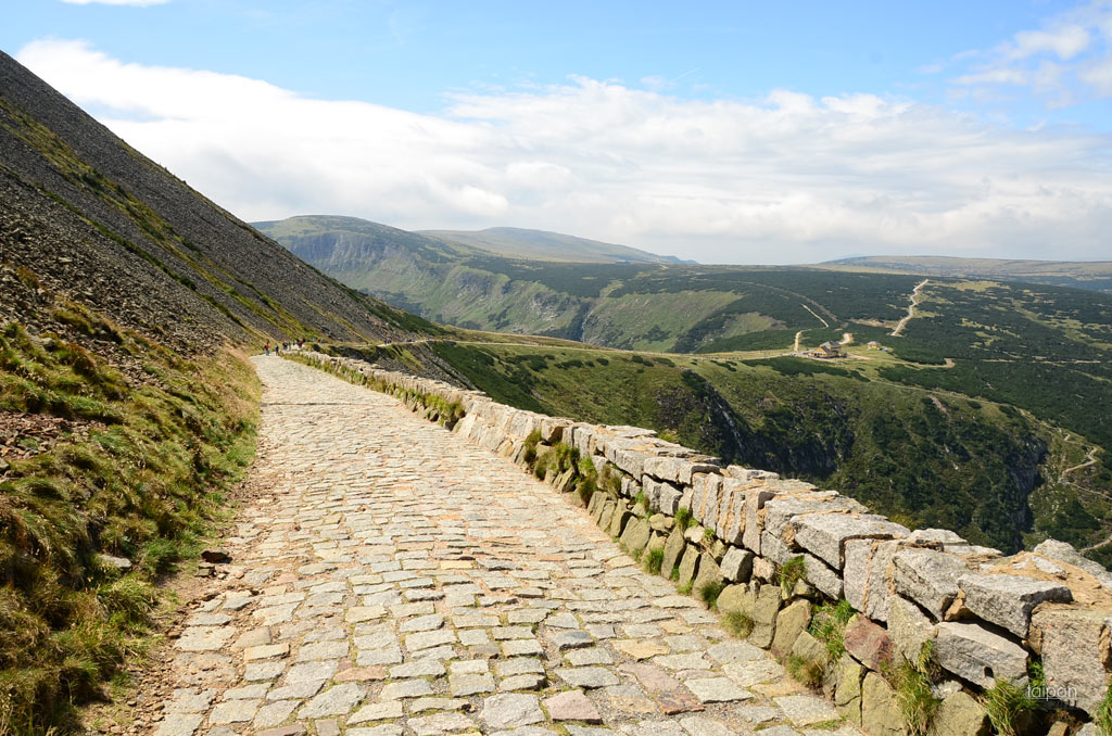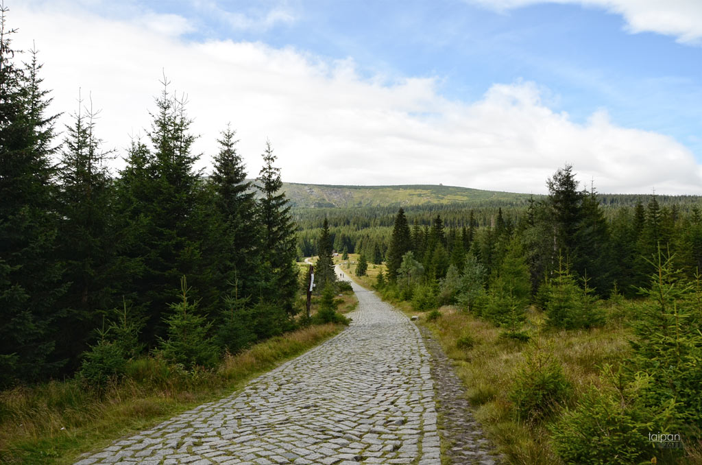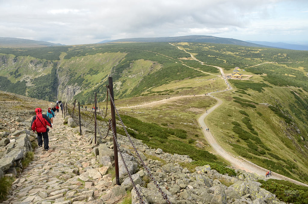 Karkonoski Park Narodowy. Wejście łagodnym, ale długim i malowniczym szlakiem niebieskim na Śnieżkę, która ma około 9 km (około 2,5-3 godz.). Początek trasy jest przy świątyni Wang przy ul. Karkonoskiej. Dalej mija się Rówienka, Polanę, Kozi Mostek. Dochodzi się do Małego Stawu, przy którym znajduje się Schronisko "Samotnia". Dalej jest wejście pod górę do Schroniska "Strzecha Akademicka". Dalej szlak prowadzi do Drogi Przyjaźni Polsko-Czeskiej, która przebiega przy granicy państw. Następnie jest długa prosta droga prowadząca do żółtego Schroniska pod Śnieżką (Dom Śląski), gdzie jest rozwidlenie kilku szlaków. Przed nami już tylko wejście na szczyt. Ja wybieram trasę krótszą ale bardziej stromą. Na Śnieżce (1602 n.p.m.) znajduje się schronisko, obserwatorium i kaplica. Droga powrotna to 8 km (ok. 2,5 godz.). Wracam alternatywną drogą Jubileuszową do Domu Śląskiego. Tam wybieram szlak czerwony, który jest na początku dosyć męczący dla stawów, ponieważ stopnie są bardzo wysokie. Sam szlak posiada duże walory widokowe. Najpierw schodzi się po stromym zboczu przez Przełęcz "Pod Śnieżką", gdzie mija się między innymi Wodospad Łomniczki i skąd znajduje się piękny widok na Śnieżkę. Dalej ścieżka jest już mniej wymagająca aż do Schroniska "Nad Łomniczką". Od tego miejsca trasa jest typowo spacerowa i wiedzie przez las. Wyjście z lasu jest przy dolnej stacji wyciągu narciarskiego w pobliżu ulicy Olimpijskiej.