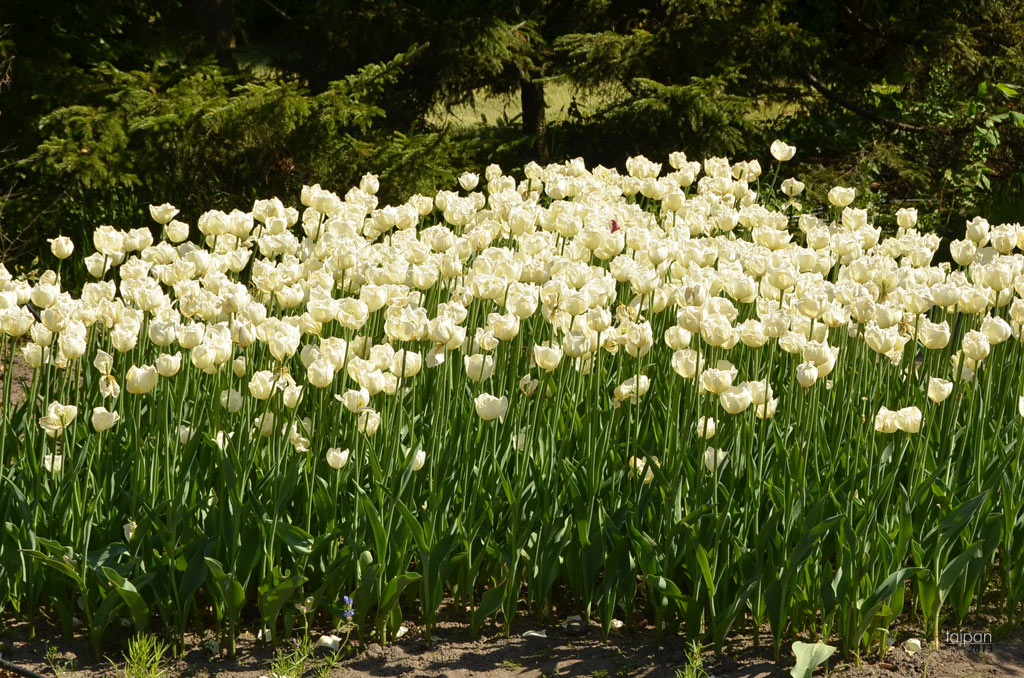 Białe tulipany "Maria Kaczyńska" w zieleni parkowej.