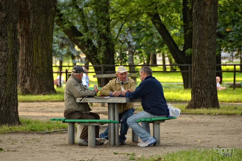 Park Staromiejski w Łodzi, zwany też "parkiem śledzia" przy ul. Zachodniej, Ogrodowej/Północnej, ze stolikami szachowymi.