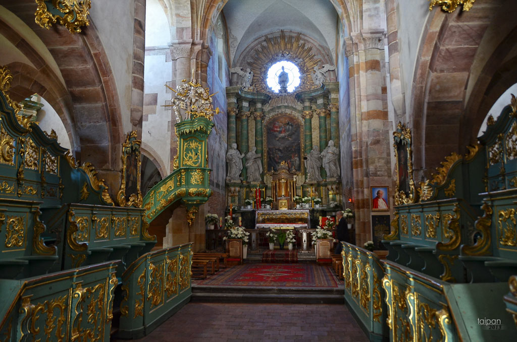 Kościół cysterski pw. św. Tomasza Kantuaryjskiego został zbudowany prawie w całości z piaskowca oraz częściowo z cegły. Zbudowany około 1232 roku w stylu romańskim - nie zmienione od chwili wybudowania. Na zdjęciu przedstawiony jest ołtarz główny, a po obu stronach nawy głównej znajdują się bogato dekorowane stalle z II poł. XVIII w.