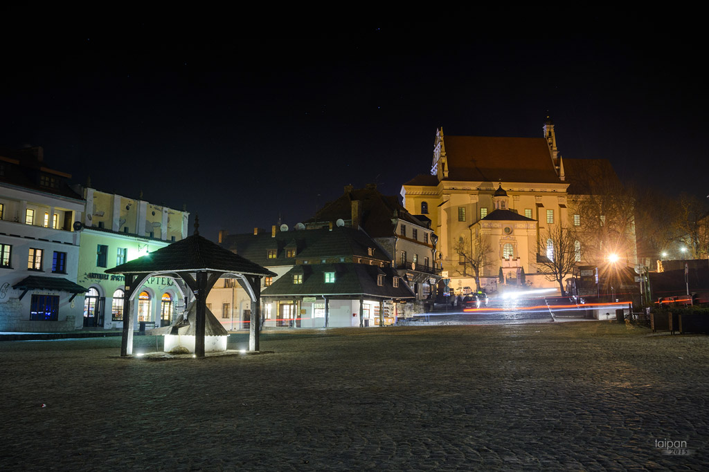 Kazimierz Dolny - rynek miasta nocą z widokiem na Kościół farny i studnię