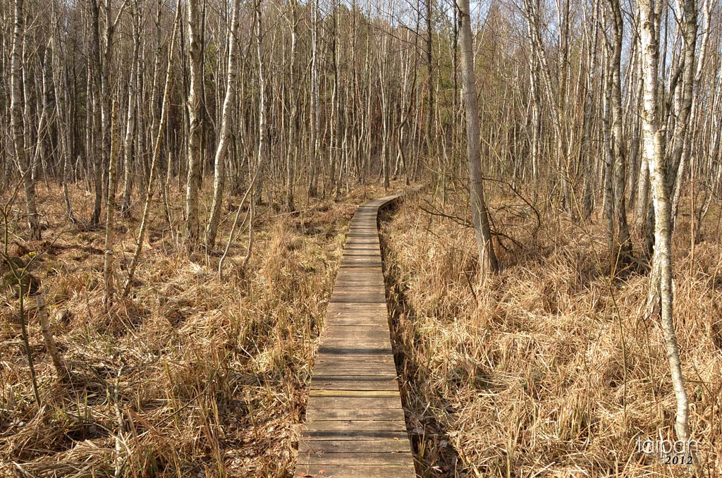 Poleski Park Narodowy - ścieżka przyrodnicza "Dąb Dominik", początek wiosny. Na zdjęciu drewniana kładka prowdząca przez bagna.