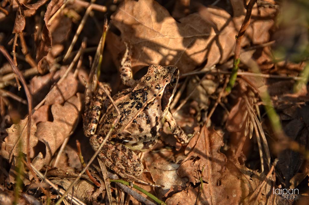 Poleski Park Narodowy - ścieżka przyrodnicza "Dąb Dominik", początek wiosny. Na zdjęciu żaba trawna.