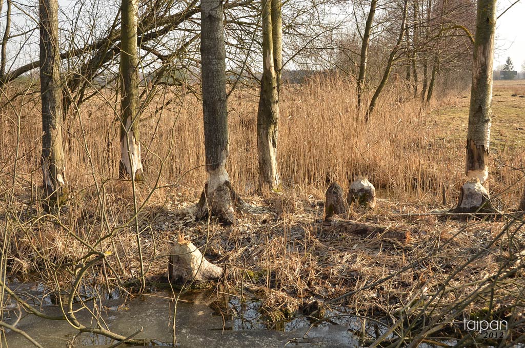 Poleski Park Narodowy - ścieżka przyrodnicza "Spławy". Na zdjęciu widać działalność bobrów - podcięte drzewa czekające na wiatr, który jest przewróci.