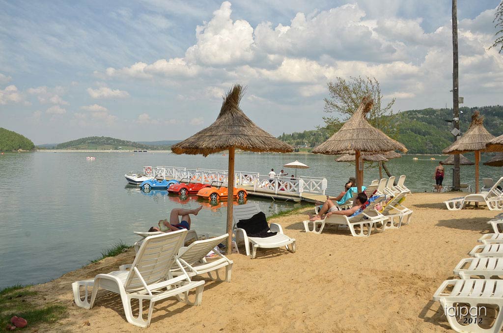 Cypel w miejscowości Polańczyk i widok na plażę przy Jeziorze Solińskim. W oddali widoczna zapora wodna w Solinie.