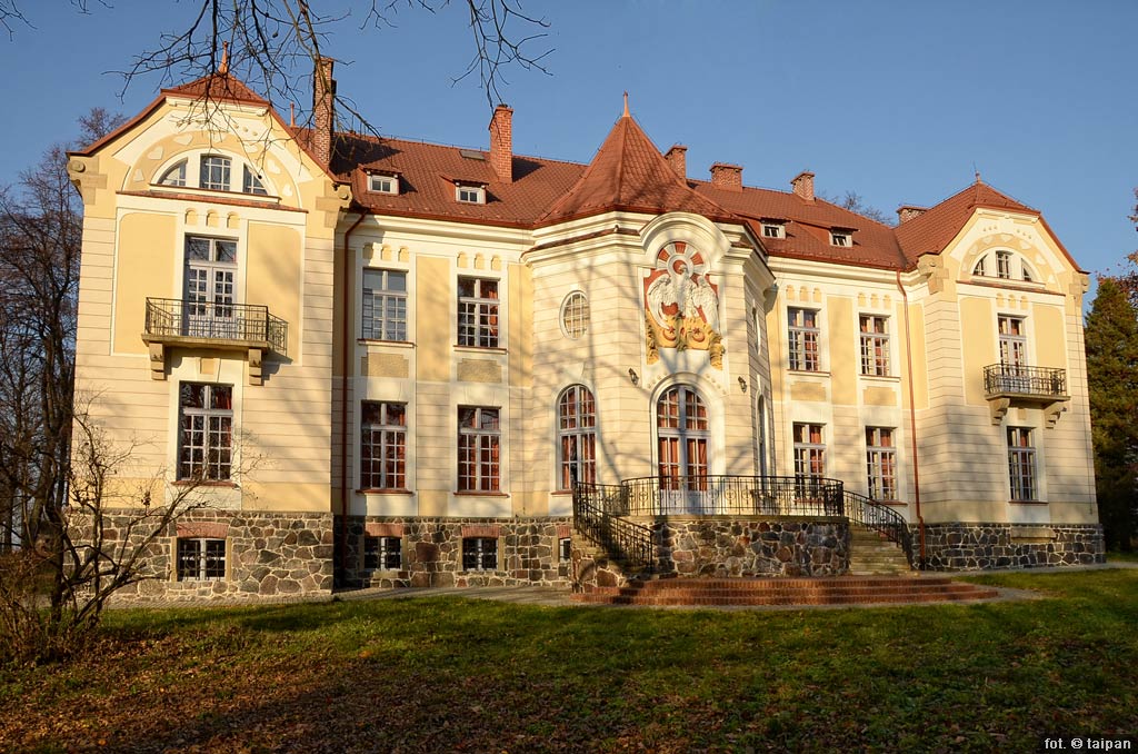 Secesyjny zabytkowy pałac rodziny Tyszkiewiczów z 1900 roku, projektu krakowskiego architekta Tadeusza Stryjeńskiego, położony w zespolone pałacowym i folwarcznym.