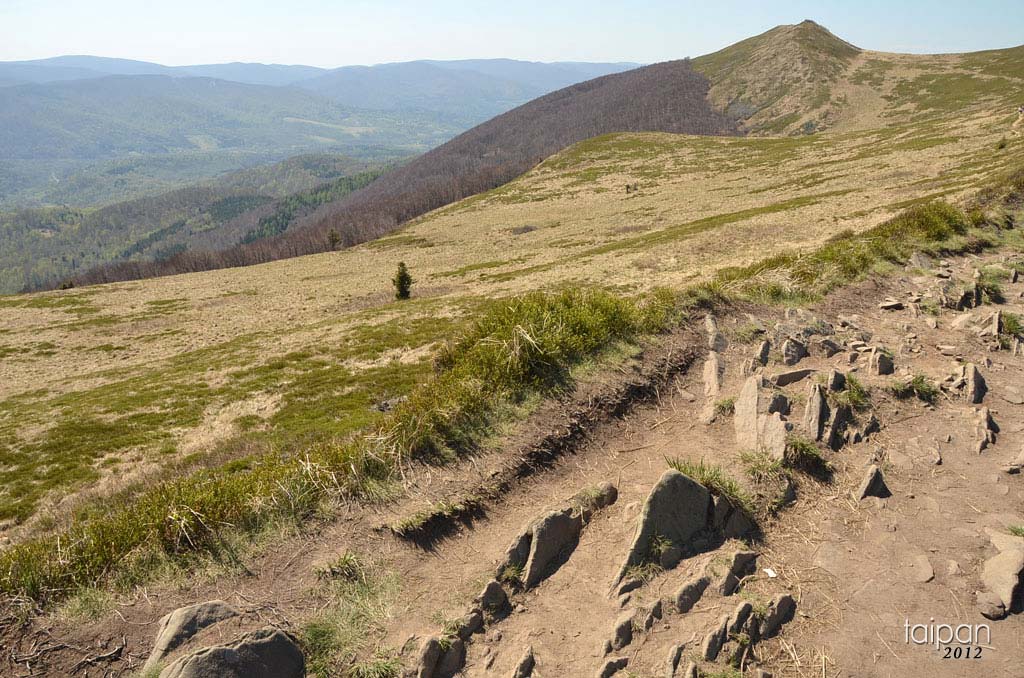 Bieszczadzki Park Narodowy. Wejście na masyw górski Połonina Wetlińska zaczynam od parkingu w Brzegach Górnych, dalej dosyć strome i męczące podejście do schroniska PTTK "Chatka Puchatka", dalej przejście przez jeden z najwyższych szczytów połoniny Osadzki Wierch (1251 m nmp.). Z Osadzkiego Wierchu kierowałem się zmierzałem do Przełęczy Orłowicza idąc przez Szare Berdo mijając po drodze strome urwisko Hnatowego Berda, z której (jak głosi legenda) po śmierci żony rzucił się na koniu zrozpaczony rycerz Hnat. Obok przechodzi się również obok powykręcanego od wiatrów lasu bukowego. Przy Przełęczy Orłowicza (1099 m nmp.) znajduje się skrzyżowanie szlaku żółtego i czerwonego. Wybieram dalej szlak czerwony i wchodzę na szczyt Smerek (1223 m npm.), na którym znajduje się krzyż. Panorama z tej góry jest warta polecenia! Zejście z góry okazaje się długie i męczące; czasami bardzo strome. Po 1,5 godziny schodzenia non stop na dole, przy parkingu, przepływa rzeka Wetlinka, w której można zamoczyć nogi i zrelaksować się :) Cała trasa jest dosyć długa, a jej przejście zajęło około 6-7 godzin, przez większość czasu idąc odkrytym terenem.
