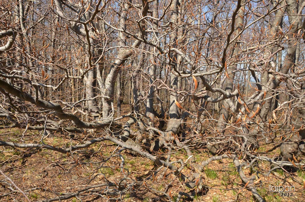 Smagane silnym wiatrem drzewa bukowe przy przejściu przez Szare Berdo.