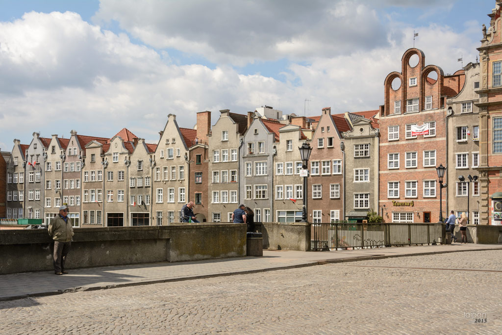 Rząd kolorowych kamienic nad rzeką Motławą w Gdańsku.