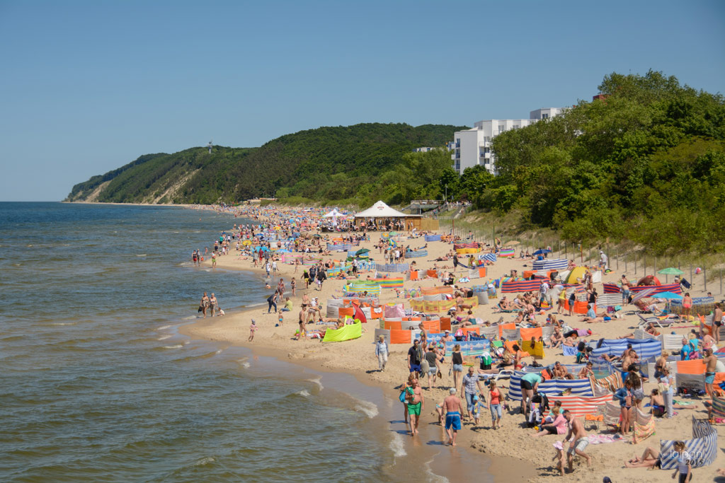 Zatłoczona piękna plaża w Międzyzdrojach.