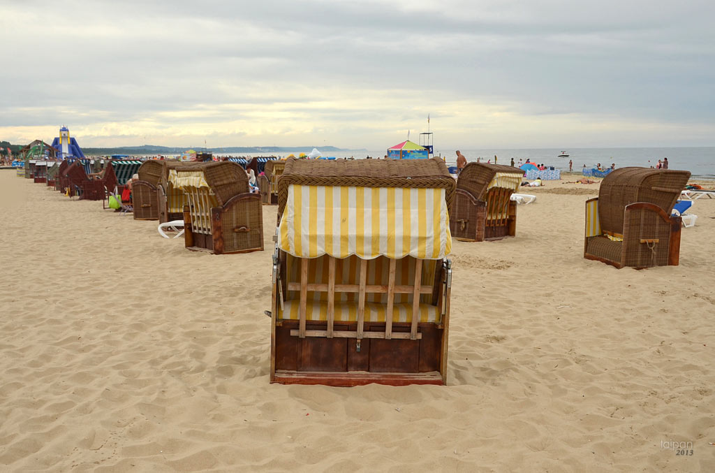 Wiklinowe kosze plażowe na plaży przy Morzu Bałtyckim w Świnoujściu