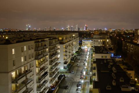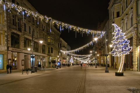 Zdjęcie ulicy Piotrkowskiej przyozdobionej dłuuuugim świetlnym łańcuchem