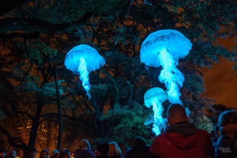 Napis "Kocham Łódź" przy Placu Wolności oraz oświetlona Off Piotrkowska