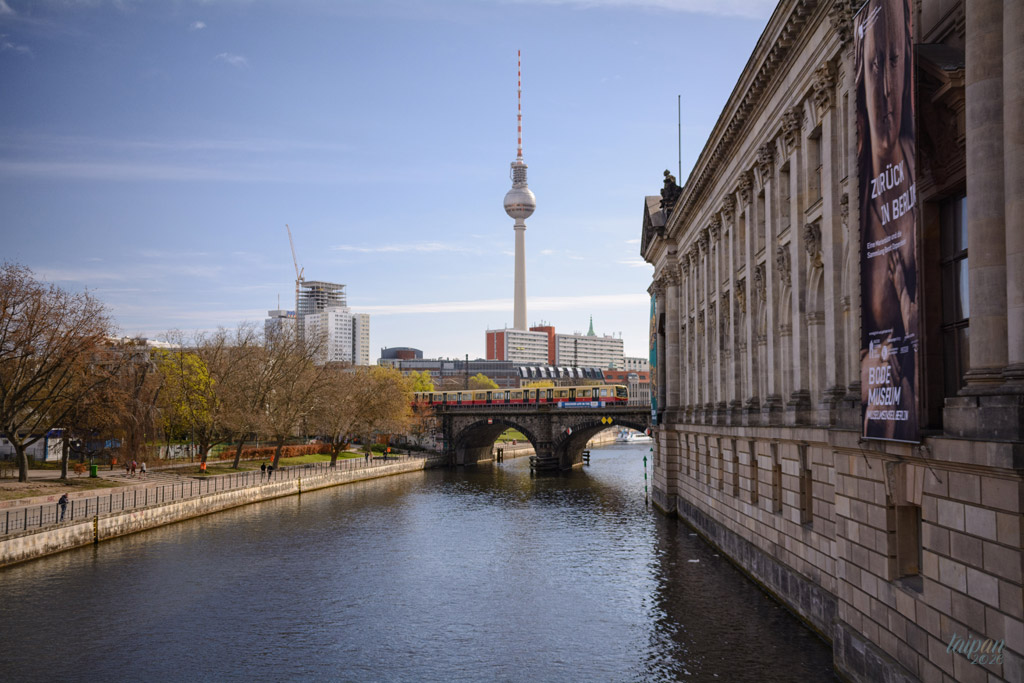 Widok z mostu Monbijoubrücke z widokiem na Berliner Fernsehturm.